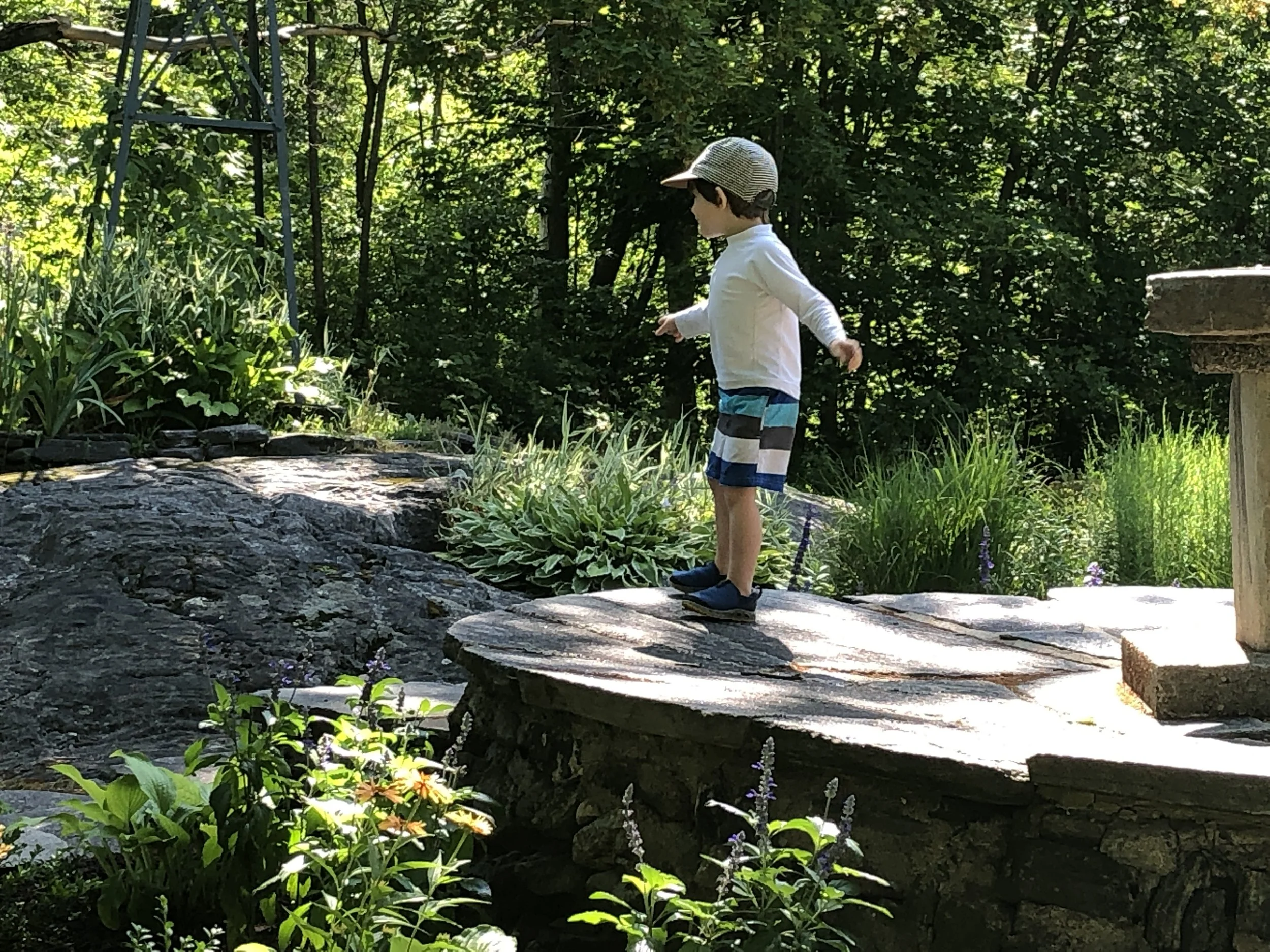 The flagstone for the pathways throughout the garden leading from the Tower to the Sundial and Pond were collected from the shoreline just north of the Smelter Wharf